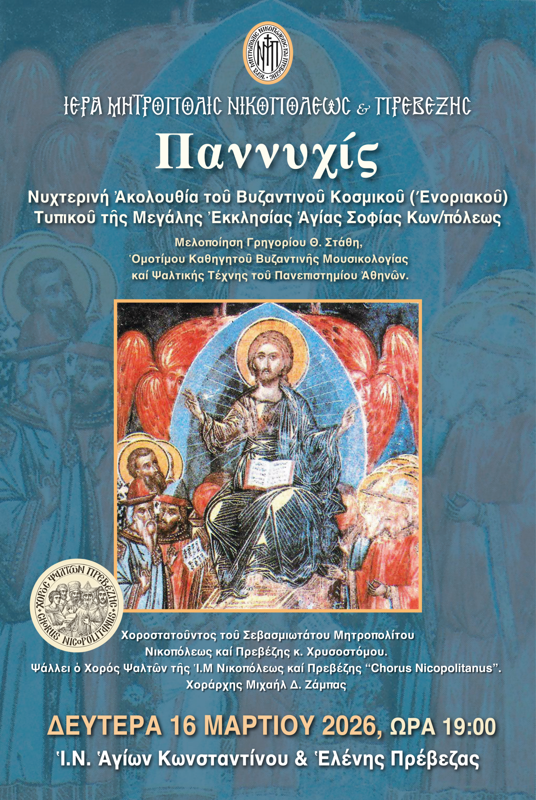 Τήν Δευτέρα 16 Μαρτίου 2026 καί ὥρα7:00 μ.μ στόν Ἱερό Ναό Ἁγίων Κωνσταντίνου & Ἑλένης Πρεβέζης θά τελεσθεῖ ἡ Ἀκολουθία τῆς Παννυχίδος, δηλαδή ἀκολουθία τοῦ ἀσματικοῦ ἤ κοσμικοῦ βυζαντινοῦ τυπικοῦ πού ἀρχικῶς ἐψάλλετο κατά τό ἑσπέρας ἐν εἴδει συντόμου ἀγρυπνίας. Θά χοροστατήσει ὁ Σεβασμιώτατος Μητροπολίτης μας κ. Χρυσόστομος καί θά ψάλει ὁ Χορός Ψαλτῶν τῆς Ἱερᾶς Μητροπόλεως «Chorus Nicopolitanus».